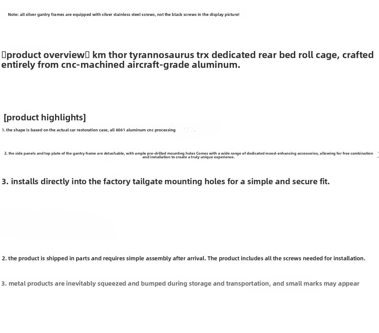 For partial delivery, the buyer must simply assemble it by himself. Long-distance transportation of the metal gantry will inevitably have some scratches. If you mind it, please don't buy it.