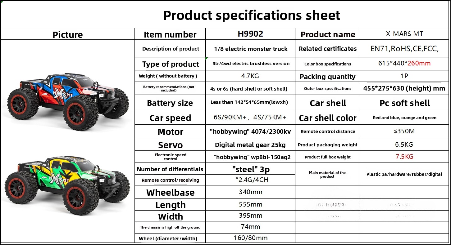 HNR H9902 1/8 4wd Brushless X-MARS MT Rc Car RTR